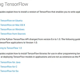 TensorFlow 썸네일형 리스트형 머신러닝 텐서플로우(tensorflow) 기본 튜토리얼 텐서플로우는 기본적으로 파이썬을 지원하고 있으나, 자바,C,Go 언어도 부분적으로 지원하고 있다.입문자들에게는 C언어가 익숙할 수 있으나, 윈도우는 지원하지 않는다.해당언어가 지원하는 플랫폼을 확인후에 설치 바람.https://www.tensorflow.org/install/ - Tensorflow 공식사이트 윈도우 사용자의 경우, Anaconda 를 설치하여 파이썬으로 하는 경우가 많다.아나콘다에 파이썬 인터프린터가 들어있으므로 따로 설치할 필요는 없어보임.https://www.continuum.io/downloads - Anaconda 다운로드참고로 python-3.5.3-amd64.exe에서 테스트가 가능하였음. https://brunch.co.kr/@mapthecity/15위 링크에서 활성화 방법.. 더보기 이전 1 다음